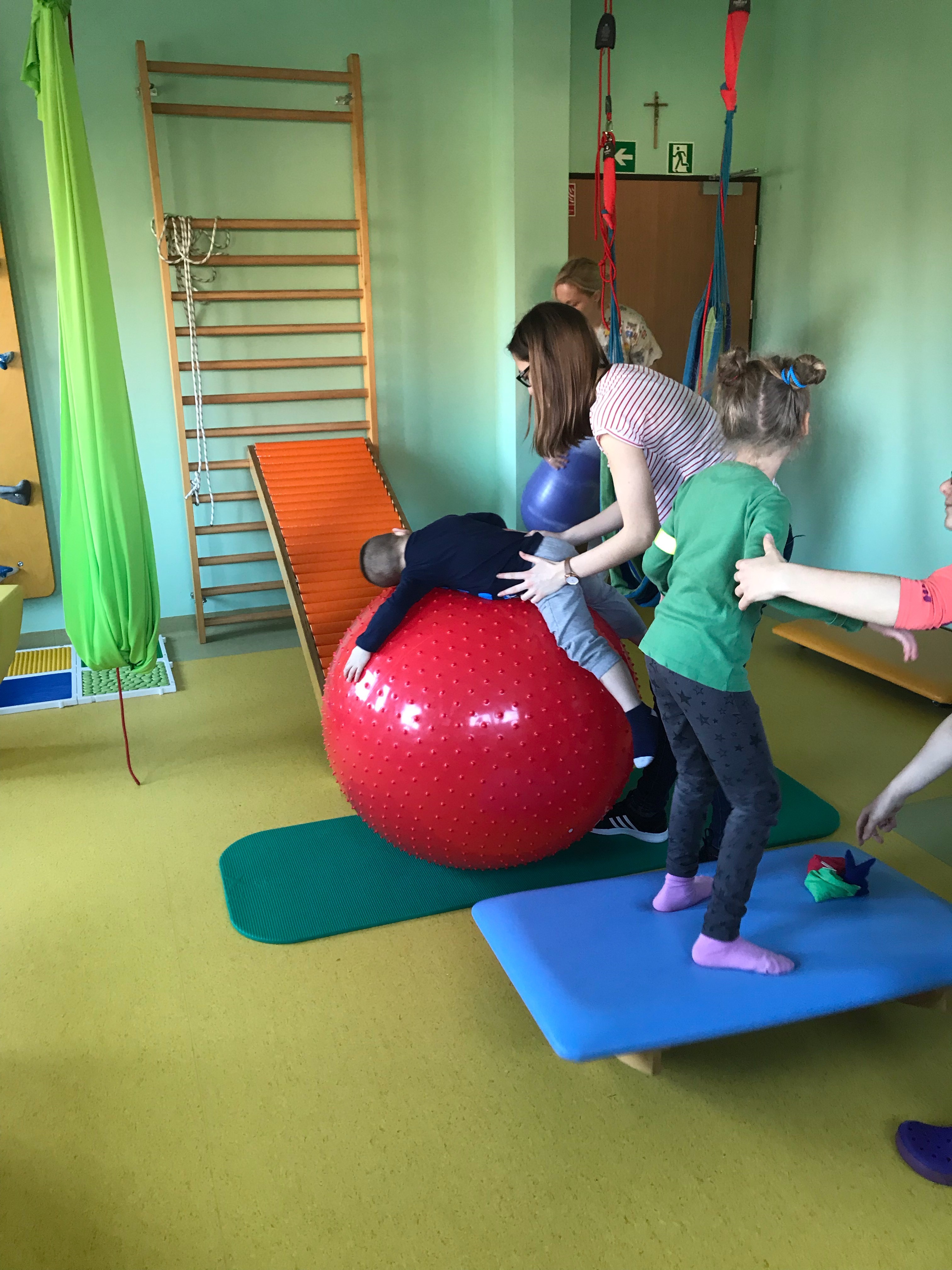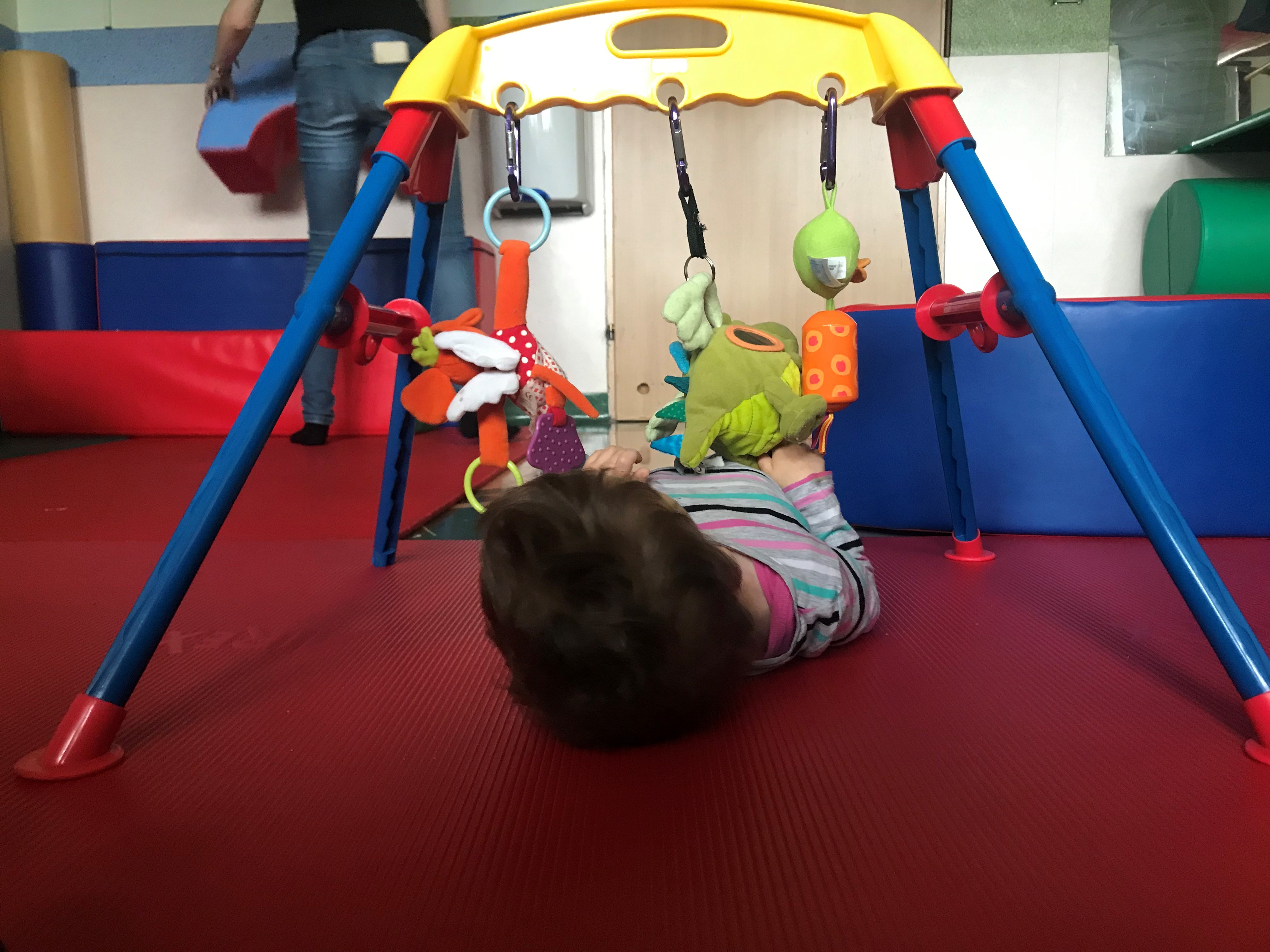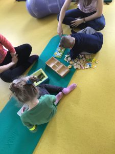 Astrid werkt met haar volgkindje tijdens de individuele therapie aan de zitbalans. En Kyana werkt bij haar volgkindje aan de hoofdbalans. We hebben samen nog een volgkindje waar we werken aan het zelfstandig stappen en concentratie. Daarnaast passen we bij onze drie kindjes shantala- massage toe en geven we eettraining. Onze individuele therapiën lopen volgens de Bobath basisprincipes die Agnieszka ons heeft toegelicht.